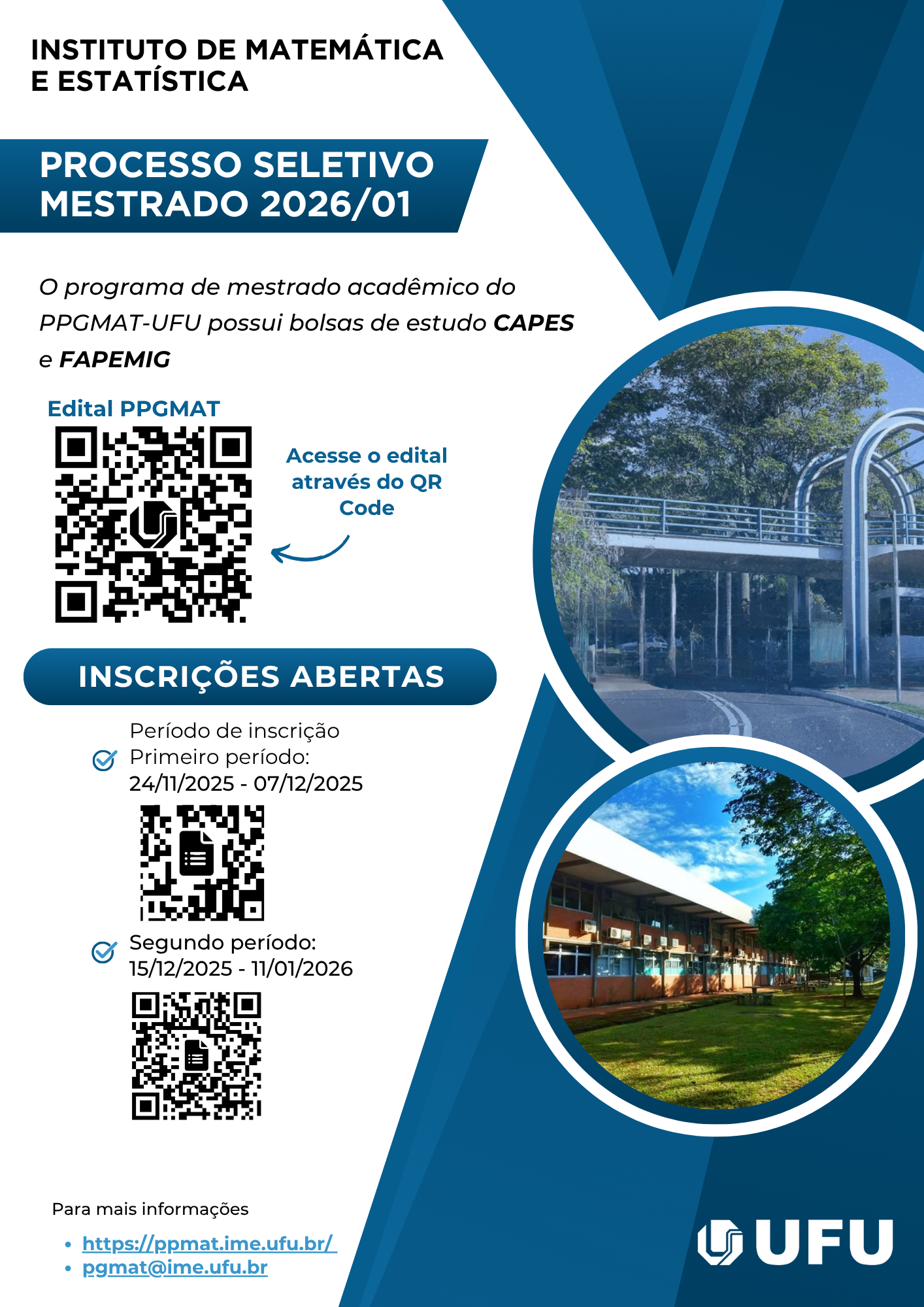 O Programa de Pós-graduação em Matemática (PPGMAT) do Instituto de Matemática e Estatística (IME) da Universidade Federal de Uberlândia (UFU), divulga o Edital 002/2025 Processo de Seleção para alunos regulares e alunos especiais, para o PPGMAT, modalidade Curso de Mestrado Acadêmico para ingresso no primeiro semestre de 2026. O processo seletivo será realizado através de ferramentas de acesso e comunicação via Internet, em dois períodos. O processo seletivo dos inscritos no primeiro período será realizado através da Análise do Resultado da Prova Extramuros de Matemática (http://provaextramuros.org.br/index.php/pt/) e Análise do Histórico Escolar. O processo seletivo dos inscritos no segundo período será realizado através da Análise do Histórico Escolar, Análise do Currículo e Prova Escrita de Conhecimento em Álgebra Linear.